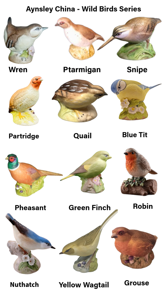 This collection features detailed illustrations of British and common wild birds, often found on plates, vases, and small figurines: